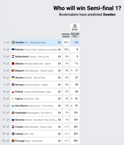 Наименьшие шансы на проход в финал у Азербайджана, Словении, Хорватии, Исландии и Португалии. Букмекеры считают, что их шансы на победу меньше 1%.