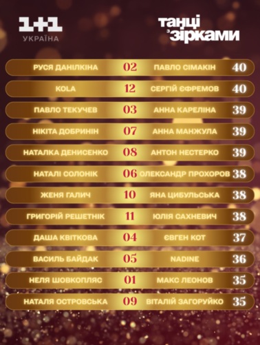 Самые низкие баллы (по 35) получили две пары – Неля Шовкопляс и Макс Леонов и Наталья Островская и Виталий Загоруйко.