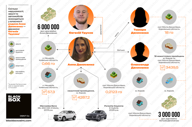 За один лишь 2024 год девушка получила в собственность две земельные участка посреди леса общей площадью 0,66 гектара в посёлке Нещеров на Киевщине, которые стоят примерно 66 тысяч долларов США, а также жилой дом площадью 57 квадратных метров. В 2023 году Анна Денисенко стала владелицей сразу ряда дорогих коммерческих помещений в центре Харькова общей площадью почти 206 квадратных метров и стоимостью примерно 250 тысяч долларов США. Кроме того, в 2025 году Денисенко приобрела ещё новый автомобиль Porsche Cayenne E-Hybrid, цена которого сегодня на рынке — 135 тысяч долларов США.