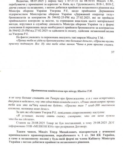 "Так, в течение 2025 установлены факты преступной деятельности Миндича Т.М. в сфере энергетики путем оказания им влияния на министра энергетики Украины Галущенко Г.В. и в сфере обороны путем осуществления им влияния на министра обороны Украины Умерова Р.Э. Успешная реализация преступной деятельности зависела от поддержки личных связей с руководителями министерств и проведения с ними, другими влиятельными должностными лицами государства систематических встреч по месту его фактического жительства. Указанная коммуникация обеспечивала Миндичу Т.М. возможность беспрепятственного получения как лично, так и подчиненными ему предприятиями значительных сумм денежных средств при содействии министра обороны Украины Умерова Р.Э., министра энергетики Украины Галущенко Г.В., а также других лиц", - сказано в документе.