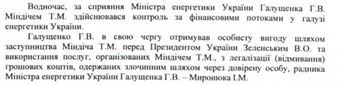 В одном из фрагментов текста указано, что Миндич оказывал покровительство министру Галущенко в глазах президента с целью контроля финансовых потоков в энергетике и отмывания денег: "В то же время при содействии министра энергетики Украины Галущенко Г.В. Миндичем Т.М. осуществлялся контроль за финансовыми потоками в отрасли энергетики Украины. Галущенко Г.В. в свою очередь получал личную выгоду путем покровительства Миндича Т.М. перед президентом Украины Зеленским В.А. и использования услуг, организованных Миндичем Т.М., по легализации (отмыванию) денежных средств, полученных преступным путем через доверенное лицо, советника министра энергетики Галущенко Г.В. - Миронюка И.".