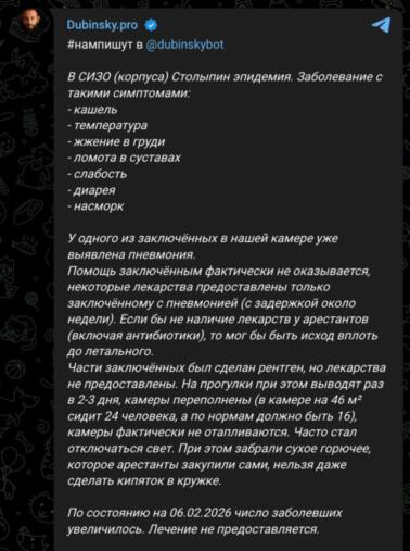 "У одного из заключенных уже выявлена пневмония", - цитирует сообщение Дубинский.