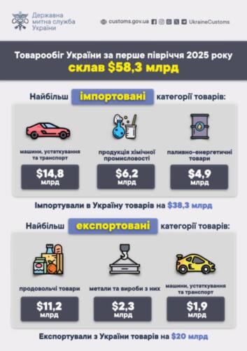 Общий объем украинского импорта в первом полугодии 2025 года увеличился сразу на 15,4% — до $38,3 млрд, а экспорт подрос лишь на 2,6% — до $20 млрд.