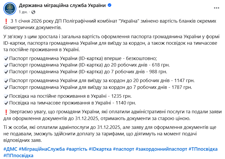 В Украине с 1 января 2026 выросла стоимость оформления паспорта гражданина Украины в форме ID-карты, паспорта гражданина Украины для выезда за границу, а также вид на временное и постоянное проживание в Украине.