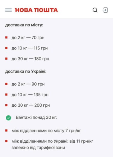 Для грузов свыше 30 кг тариф по городу между отделениями составит 7 грн за килограмм, а по Украине между отделениями - от 11 грн за килограмм в зависимости от тарифной зоны.