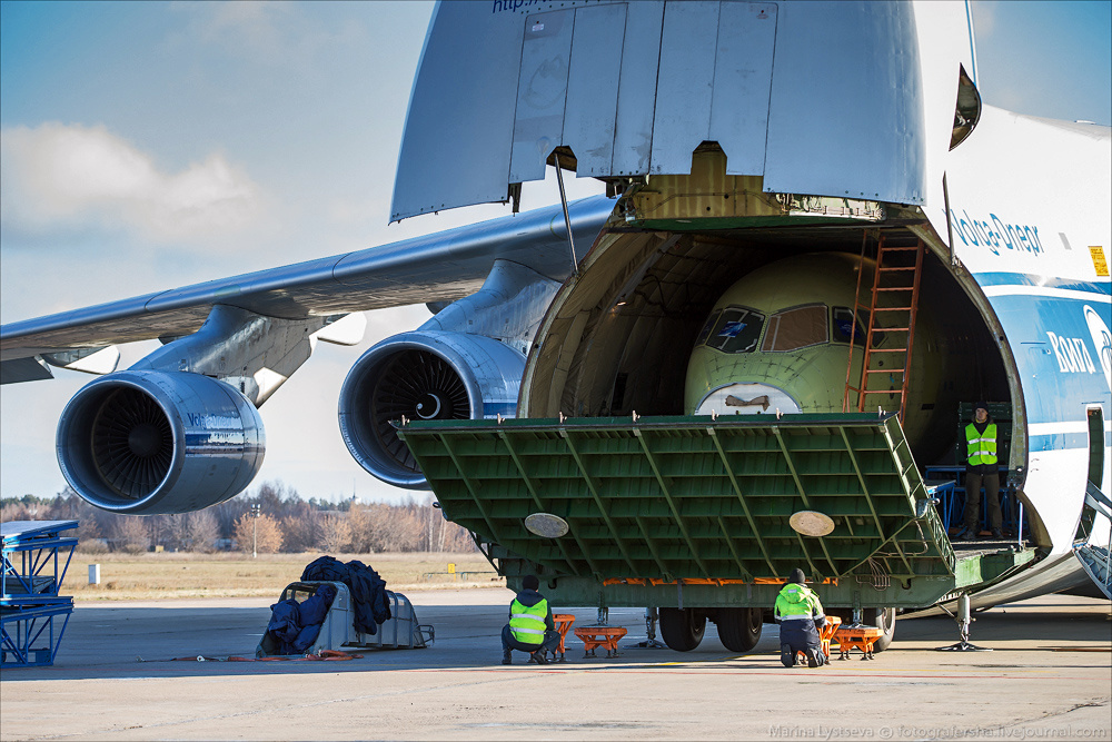 2. Суперджет, сертифицированная модель RRJ-95LR-100, с заводским номером 95075 был доставлен в Жуковский на аэродром Раменское самолетом АН-124 «Руслан» в расстыкованном виде