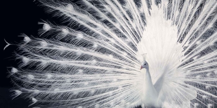 Белый тигр на чёрном фоне. Взгляд животного пронизывает зрителя насквозь. Автор: Tim Flach.