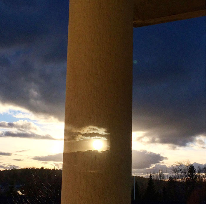 Изображение, отраженное от двойного оконного стекла, позволяет увидеть скрытое колонной солнце.