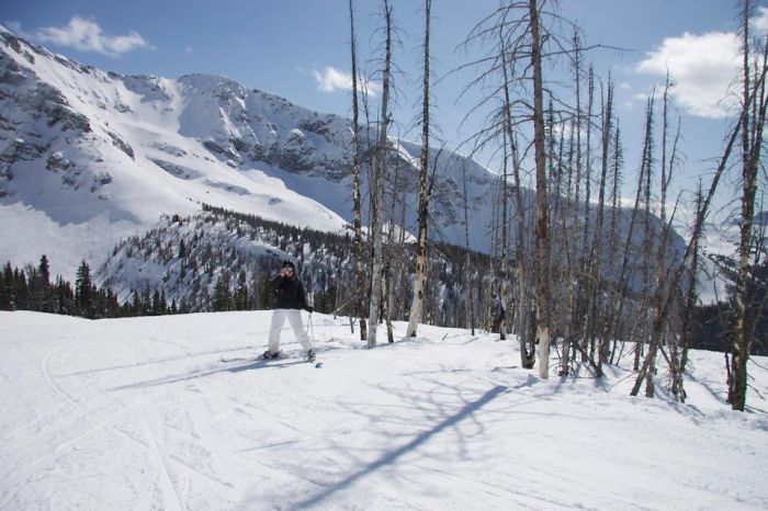 Лыжник в костюме просто растворился на фоне снежного пейзажа.