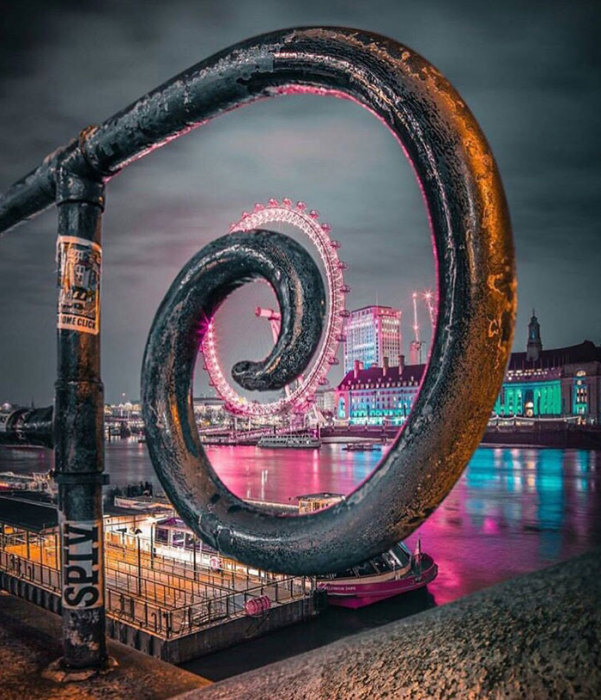 Отлично подобранный ракурс – перила, подсвеченные розовыми огнями колеса обозрения.