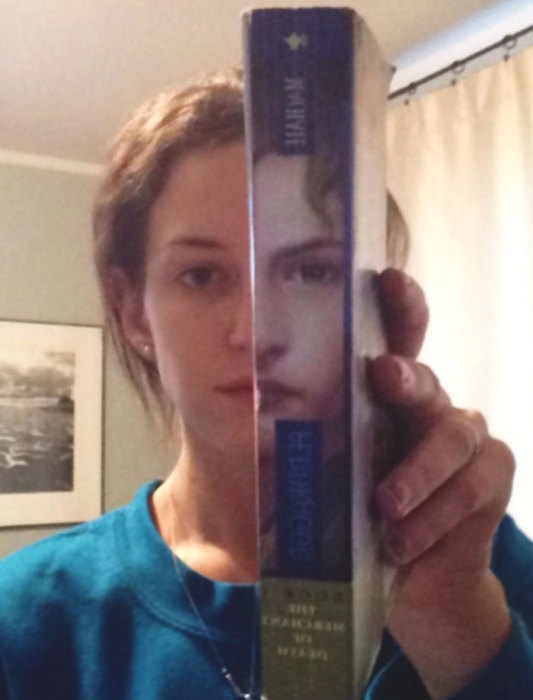 Удивительное совпадение рисунка на корешке книги – фрагмента мужского портера – с лицом девушки.