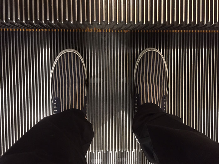 Полосатые кроссовки и движущийся эскалатор - головокружительное сочетание.