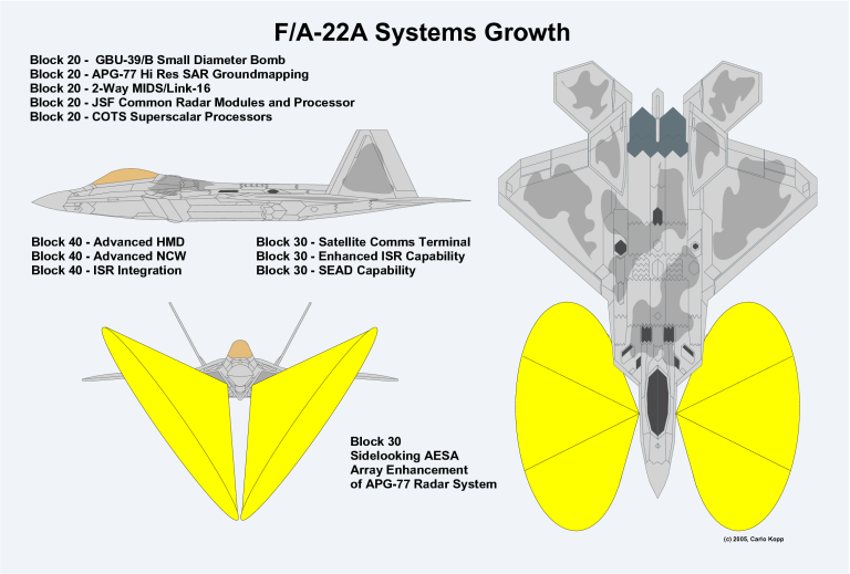 1. Первый путь, дорогой и бескомпромиссный. Установка нескольких АФАР. Путь, от которого по причине дороговизны когда то отказались в ходе разработки истребителя F-22A, впрочем, зарезервировав в фюзеляже место под возможную установку дополнительных АФАР в светлом будущем: