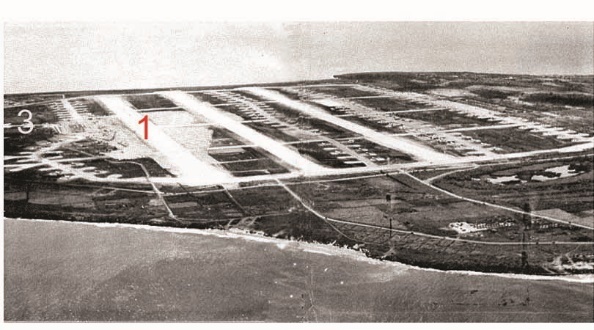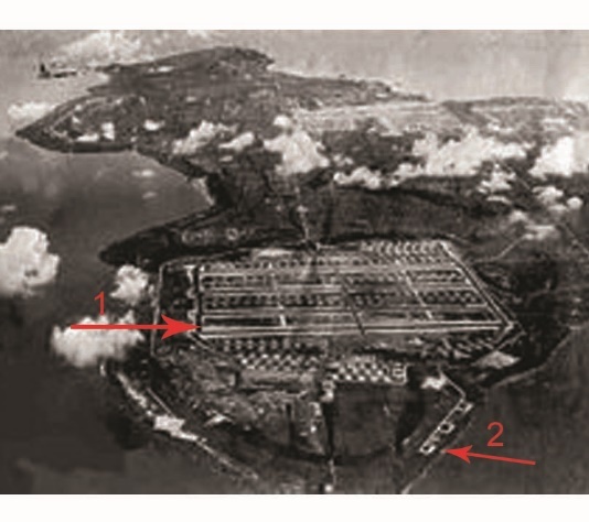 Авиабаза «Норт-Филд» на о. Тиниан. 1 – взлетная полоса «Эйбл», с которой взлетала «Энола Гэй»; 2 – «Атомная хижина» - место сборки бомб;