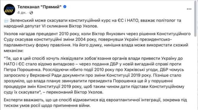 "То, что таким способом хотят ликвидировать обязательства органов власти привести Украину к НАТО и ЕС, стало известно случайно - через представление ГБР (Государственное бюро расследований - Ред.) в новом вымышленном деле против Петра Порошенко. Расследуя якобы события 2010 года, связанные с Харьковскими соглашениями, ГБР почему-то запросило у Верховной Рады документы о внесении изменений в Конституцию в 2019 году. Позже стало понятно, что власть планирует обвинить президента Порошенко также в нарушении процедуры изменения Конституции 2019 года, чтобы таким образом дать Конституционному суду основания их отменить", - заявил телеканалу Уколов.