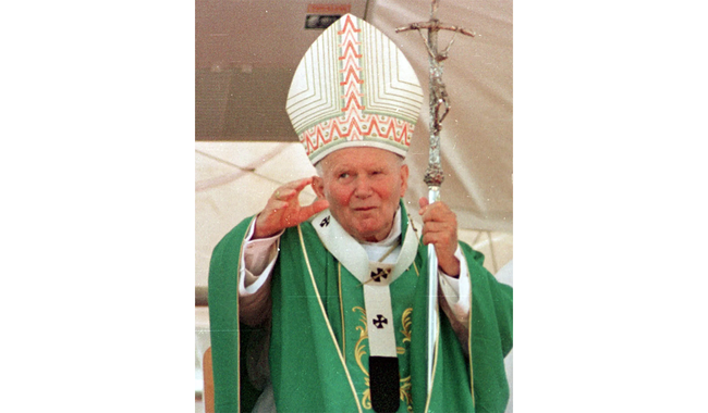 Паллиум на Иоанне Павле II. В руках у Папы - папская ферула как знак власти. Фото: britannica.com