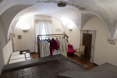 После избрания в Сикстинской капелле Папа направляется в «комнату слез» (Sacrestia Lacrimatoria) - небольшое помещение рядом с капеллой, где он впервые надевает папскую одежду. Название комнаты связано с эмоциями, которые испытывает новый Папа, осознавая тяжесть своей миссии. Портные быстро подгоняют сутану, шапочку и другие элементы, после чего Папа готовится к появлению на балконе собора Святого Петра для объявления - Habemus Papam!
