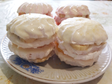 На нижний, смазанный кремом, кусочек зефира укладываем 3-4 кольца банана, промазать кремом, накрываем вторым кольцом, на который укладываем апельсин, промазать кремом, на третий кусок зефира снова укладываем бананы, а закрываем весь зефир шапочкой - верхним кусочком, который с обеих сторон промазываем сметаной. Внутренние кусочки зефира смазываются кремом с двух сторон, чтобы бананы и апельсины не соскальзывали.
