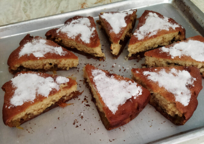 Разрезаем ан несколько порционных частей, по желанию можно посыпать сахарной пудрой.