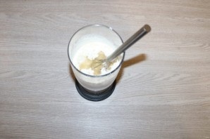 Добавьте кипяток в молоко, чтобы получилось тёплая жидкость, затем введите остальные ингредиенты. Всё перемешайте миксером или венчиком.