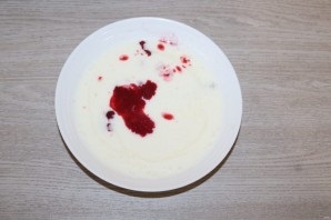 шаг 9. В жидкий йогурт добавьте сахар по вкусу, выделившийся от вишни сок и желатин. Хорошо перемешайте.