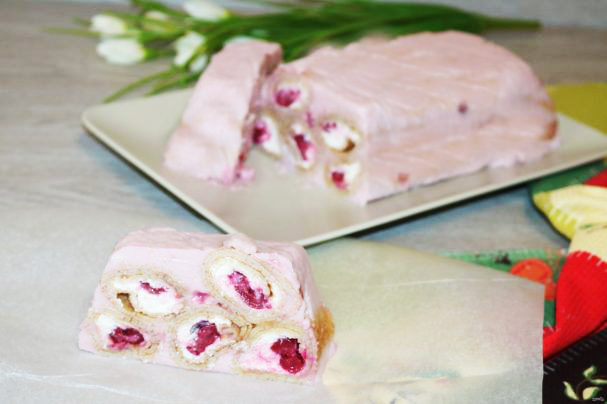 шаг 11. На творожную начинку выложите дорожку из вишни.