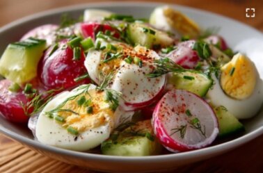 - Смешать все в миске, посолить, поперчить и заправить сметаной. Перемешать и сразу подавать, пока редис не пустил много сока.