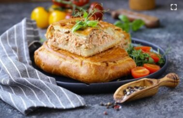 - Выложить начинку ровным слоем, накрыть вторым пластом теста, защипать края. Сделать несколько проколов сверху вилкой для выхода пара.