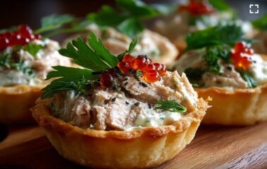 - Готовую начинку аккуратно разложить по тарталеткам незадолго до подачи, чтобы они не успели размокнуть.