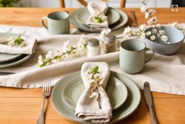 - Текстиль играет важную роль в создании настроения. Тканевые салфетки можно подобрать в тон общей палитре и интересно оформить — перевязать лентами, украсить веточками вербы или элегантно сложить на тарелках. Если скатерть нейтральная, дополнительно можно использовать дорожки на стол красного, зеленого, серо-синего или любых других цветов.