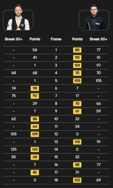 Лишь Джон Хиггинс (2010) и Марк Аллен (2022) сумели отыграть такое отставание в 5 фреймов в финалах UK Championship до 10 побед.