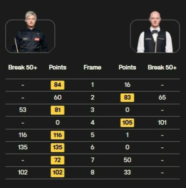 После этого Нил Робертсон уверенно довел матч до победы серией в 102 очка и выиграл поединок со счетом 6:2. Этот счет был зафиксирован на табло во всех 8 матчах 1/8 финала.