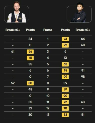 Ранее в полуфиналах Джадд Трамп обыграл австралийца Нила Робертсона (10:4), а Чжао Синьтун разгромил шотландского ветерана Джона Хиггинса (10:1).