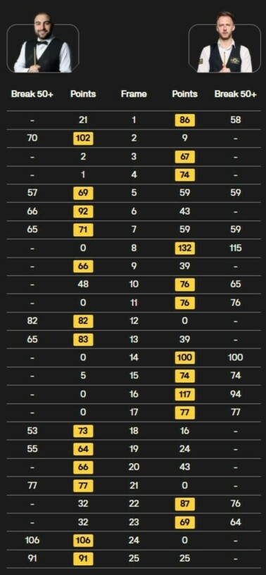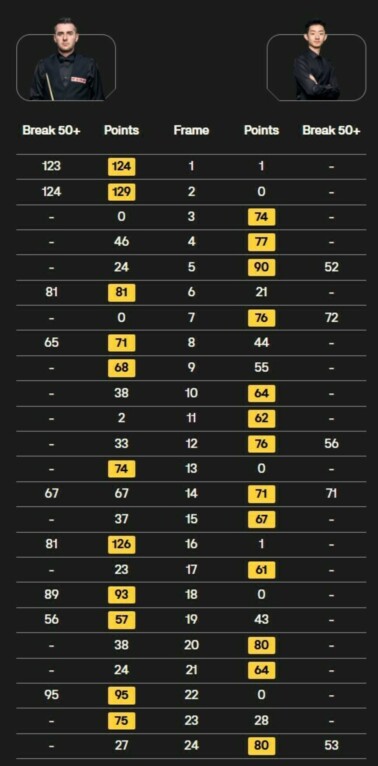 Это была седьмая встреча Эль Класико между О’Салливаном и Хиггинсом в Крусибле, и теперь шотландец ведет 4:3. Также он одержал первую победу в их очном противостоянии с 2021 года, прервав серию из трех поражений.