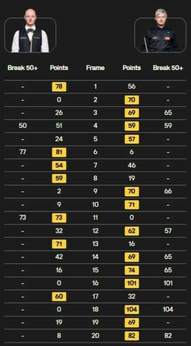 Следующим испытанием для 44-летнего Нила Робертсона станет матч с Хиггинсом до 25 фреймов, который начнется 28 апреля днем. Это будет их первая встреча в Крусибле с 2019 года, тогда шотландец победил 13:10 на этой же стадии. Также Хиггинс выиграл их последний очный матч – 6:1 на Players Championship в феврале.
