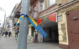 На выходе из метро раздают красочные листовочки и желто-синие ленточки с коньячными звездочками ЕС.