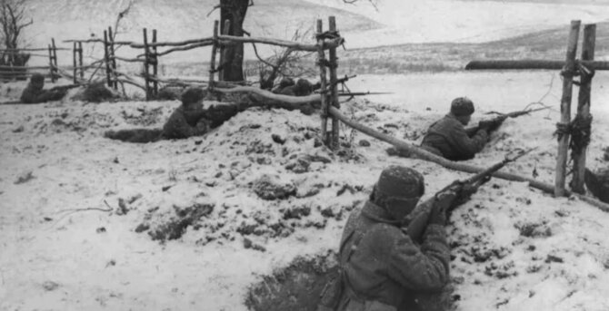 Дело было зимой, советские и германские войска стояли по обе стороны небольшой реки. Немцы заняли более выгодную позицию – на высоком берегу, наши залегли снизу. Атаковать было бесполезно – советские войны были бы у фашистов как на ладони. Немцы же тоже не хотели оставлять удобную позицию. От скуки перекрикивались («Рус, сдавайся!»), переругивались, иногда постреливали.