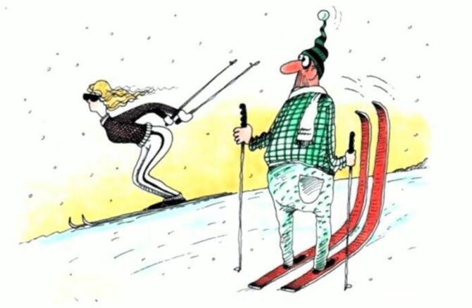 Зима. Горнолыжная трасса. На склоне лыжник в полной экипировке: очки, шлем, модный костюм. Несется со склона и подпрыгнув на трамплине падает кубарем и врезается в дерево. Встает: палки погнуты, лыжи поломаны, костюм в клочья, очки разбиты, все лицо в крови и не хватает зубов. Отряхивается, подымает взгляд обратно на вершину спуска и говорит: «Блин! Все равно лучше чем на работе!»